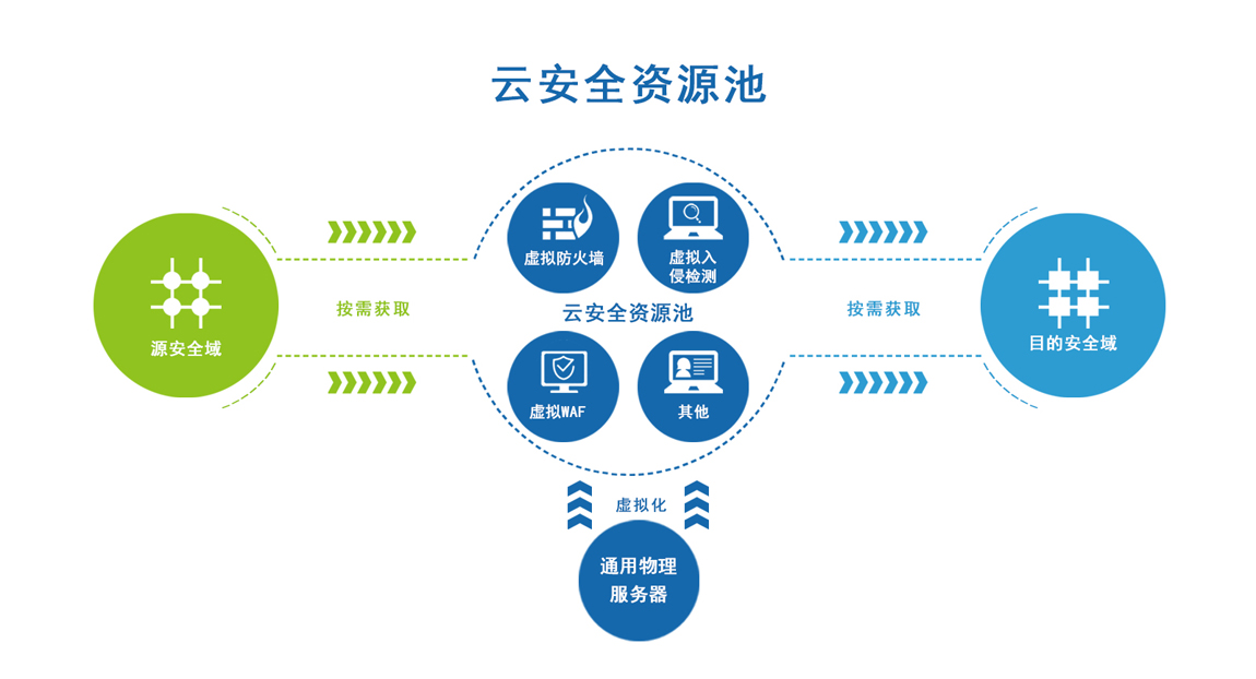 传统的安全防护手段都是硬件物理设备部署在安全边界上,每新建一个系统就要新购置一批安全设备,而且面临着一堆实施部署的难题。进入云环境后,计算资源、存储资源、网络资源都虚拟化了,安全资源也理应虚拟化。通过建设动态可弹性扩展的安全资源池,在资源池里部署软件安全设备,实现安全资源的池化。