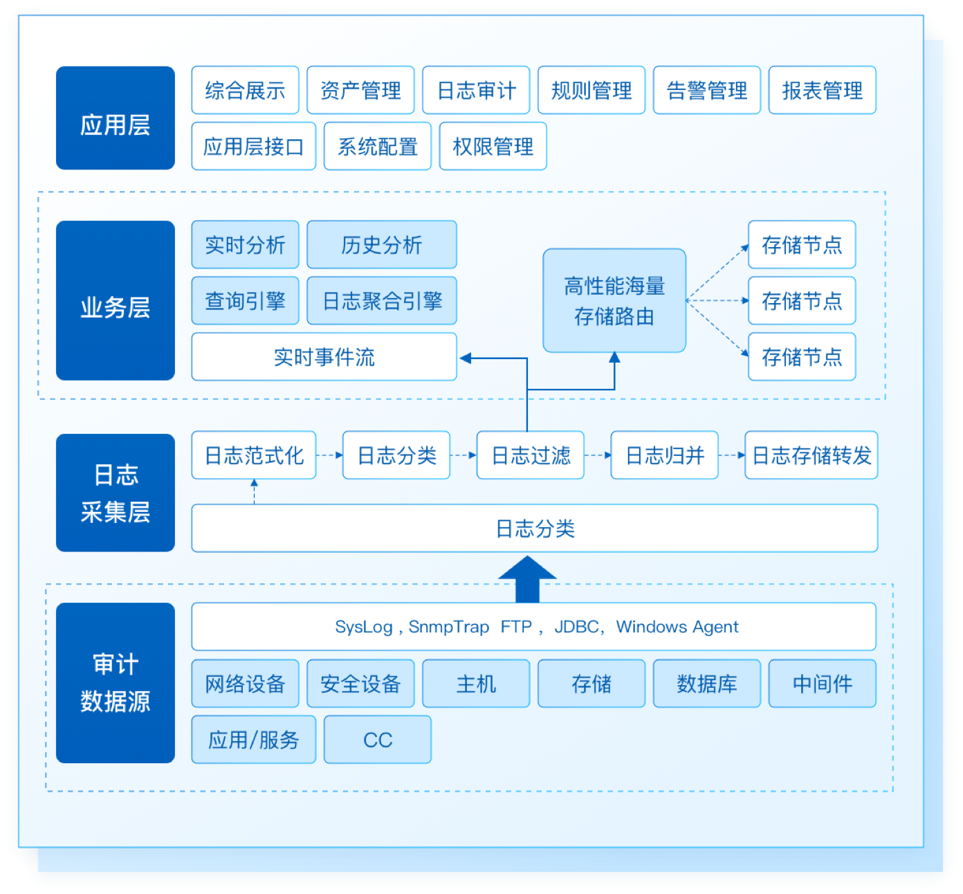 云翼日志审计系统是瑞和云图自主研发的一款拥有自主知识产权的专业信息安全审计系统,系统通过监测及采集信息系统中的系统安全事件、用户访问行为、系统运行日志、系统运行状态等各类信息,经过规范化、过滤、归并和告警分析等处理后,以统一格式的日志形式进行集中存储和管理,结合丰富的日志统计汇总及关联分析功能,实现对信息系统整体安全状况的全面审计。